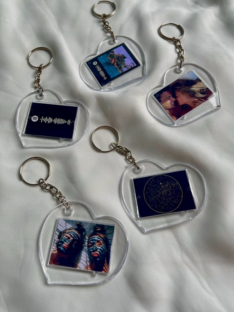 Nosso chaveirinho é de acrílico e possui 5,5 cm de altura x 6 cm de largura, com uma foto 3 x 4 dentro.