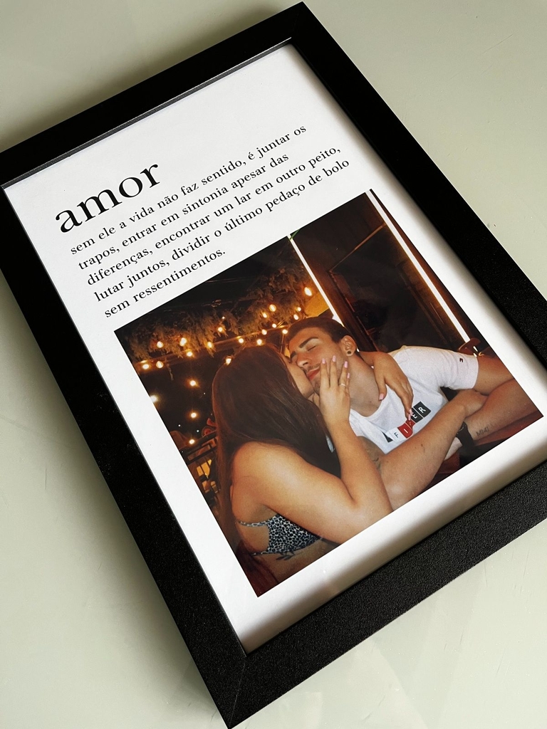 O quadro essência é uma das nossas criações mais especiais. Ele é perfeito para aqueles que desejam uma peça de decoração personalizada, com um significado especial. Esse quadro vem com quatro opções de palavras para escolher: mãe, pai, amor e amizade. Cada palavra é apresentada em destaque no quadro, acompanhada de uma breve explicação sobre seu significado. O cliente pode escolher uma foto que melhor represente o significado da palavra escolhida e adicioná-la abaixo do texto, além de escolher a cor da foto e da moldura. Essa é uma maneira única de personalizar o quadro e torná-lo ainda mais significativo. O quadro essência é perfeito para presentear alguém querido, ou para decorar seu próprio espaço com um toque de significado e beleza. Com um design elegante e atemporal, ele é capaz de combinar com qualquer estilo de decoração e trazer uma energia positiva para o ambiente.